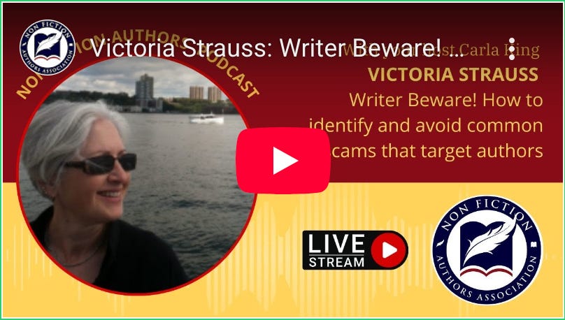 Check out my interview with Victoria Strauss in the podcast I used to run for the NFAA. Victoria is founder of Writer Beware, hosted at the Science Fiction & Fantasy Writers Association website. In this 30-minute interview we expose the many ways writers can fall into the hands of unscrupulous services.