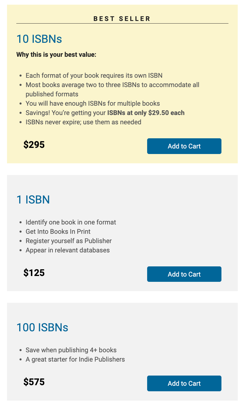 Once you purchase your block of ISBNs, you’ll see each number has the same publisher ID, as shown above.